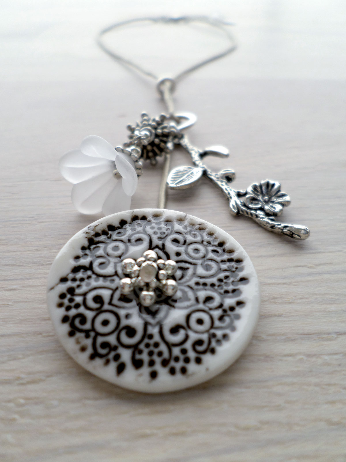 Ce collier ras de cou se compose de deux médaillons en métal aux motifs arabesque et d’une perle en porcelaine façonnée à la main. Vous trouverez également une charmante séquence de perles en bois et en métal qui décore la partie centrale du collier.
